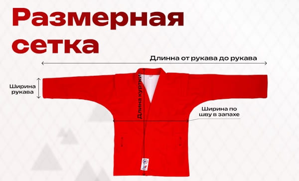 | Размер | Рост | Обхват груди | Длина от рукава до рукава | Длина куртки | Ширина по шву в запахе | Ширина рукава | Длина пояса |